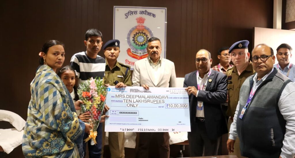 इस दौरान स्वर्गीय सहायक उप निरीक्षक शेषनाथ चौबे के परिजनों को तथा स्वर्गीय प्रधान आरक्षक अनित मंडवी के परिजनों को एसबीआई पुलिस सैलरी पैकेज योजना के अंतर्गत 10–10 लाख रुपये की आर्थिक सहायता का चेक प्रदान किया गया।