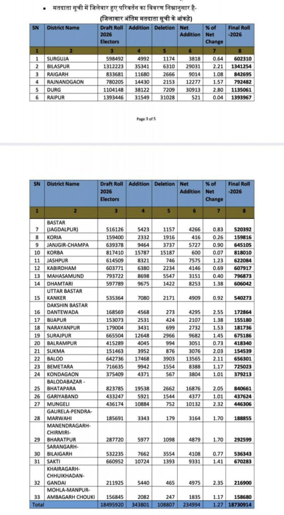 चार महीने तक चली निरंतर प्रक्रिया के बाद, दिनांक 01.01.2026 की अर्हता तिथि के संदर्भ में आज दिनांक 21.02.2026 को सभी मतदान केंद्रों सहित प्रत्येक निर्धारित स्थानों पर निर्वाचक नामावली की अंतिम प्रकाशन कर दिया गया है।यह निर्वाचक नामावली सूची मुख्य निर्वाचन पदाधिकारी छत्तीसगढ़ की वेबसाइटhttps://ceochhattisgarh.nic.in/पर भी उपलब्ध है, जहाँ मतदाता अपने विवरण की जाँच कर सकते हैं।इस प्रक्रिया की मुख्य बातें निम्नलिखित हैं:राजनीतिक दलों को प्रतिः प्रत्येक जिले में सभी मान्यता प्राप्त राजनीतिक दलों को अंतिम प्रकाशित निर्वाचक नामावली की दो प्रतियां (1) फोटो युक्त प्रिंटेड और 1 बिना फोटो वाली सॉफ्ट कॉपी) निशुल्क साझा की गई।फोटोग्राफ अपडेटः (SIR) विशेष गहन पुनरीक्षण (एसआईआर) कार्यक्रम के दौरान नागरिकों से प्राप्त नवीनतम फोटोग्राफ भी अंतिम मतदाता सूची में प्रकाशित की गई।