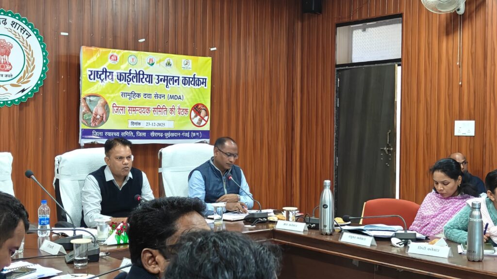 राष्ट्रीय फाइलेरिया उन्मूलन कार्यक्रम के अंतर्गत सामूहिक दवा सेवन (एमडीए) अभियान को प्रभावी ढंग से संपादित करने के उद्देश्य से जिला समन्वय समिति की बैठक कलेक्टर सभा गृह में आयोजित की गई। बैठक की अध्यक्षता जिला स्वास्थ्य समिति के अध्यक्ष एवं कलेक्टर केसीजी इंद्रजीत सिंह चंद्रवाल ने की।